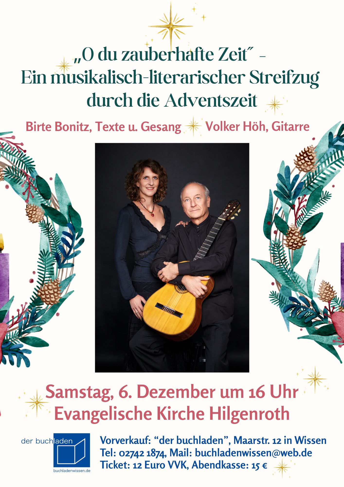 Der buchladen Wissen lädt am Nikolaustag, dem 06.12. um 16 Uhr zu einem musikalisch-literarischen Streifzug durch die Adventszeit mit Volker Höh (Gitarre) und Birte Bonitz (Lesung und Gesang) in die evangelische Kirche in Hilgenroth ein. Das erfolgreiche Duo, das mehrfach das Programm der Westerwälder Literaturtage bereichert hat, verwebt hochkarätigen Musikgenuss mit Texten, Gedanken und Gedichten verschiedener AutorInnen zu einem festlich-besinnlichen Programm, das keinen unberührt lässt. Geboten wird ein musikalisch-literarisches Konzert, das die feierliche Stimmung – auch singend und mitsingend – in die Herzen trägt und die lichtvolle Botschaft der Adventszeit bildreich und einfühlsam bewusst werden lässt. Ein Programm für Sinne und Seele, zum Träumen, Freuen und Nachdenken.